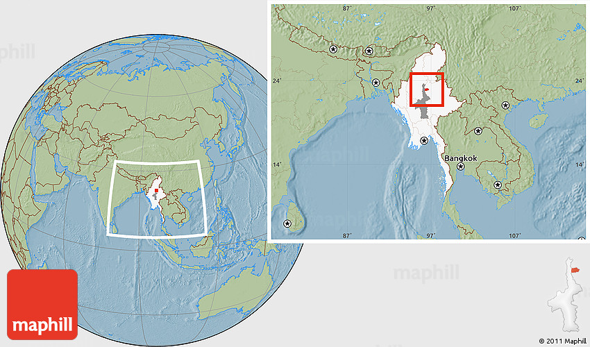 Each map type offers different information and each map style is designed for a different purpose. Read about the styles and map projection used in the above map (Savanna Style Location Map of Mogok, highlighted country, highlighted parent region, within the entire country, hill shading).
