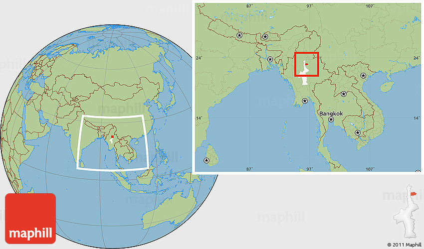Maphill is a collection of map images. This image combines a savanna style map with the globe centered on Mogok. Use the buttons under the image to switch to different map types.