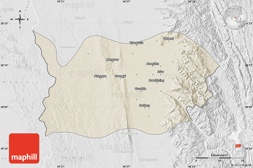 The flat shaded relief map represents one of several map types and styles available. Look at Tatkon, Mandalay, Burma from different perspectives.