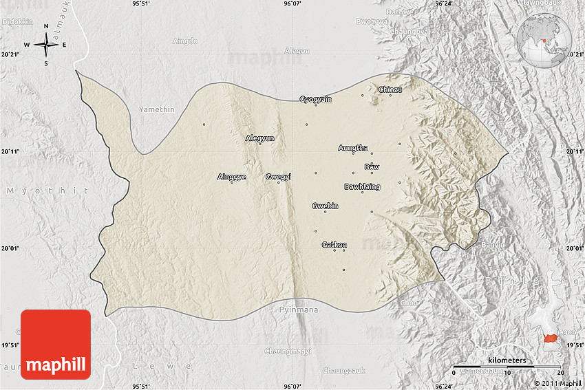 The flat shaded relief map represents one of several map types and styles available. Look at Tatkon, Mandalay, Burma from different perspectives.