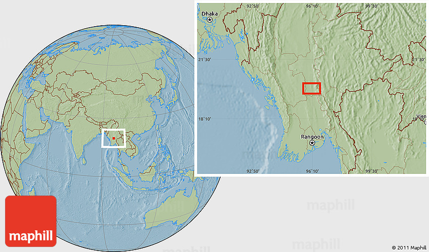 Maphill is a collection of map images. This image combines a savanna style map with the globe centered on Nyaunglu. Use the buttons under the image to switch to different map types.