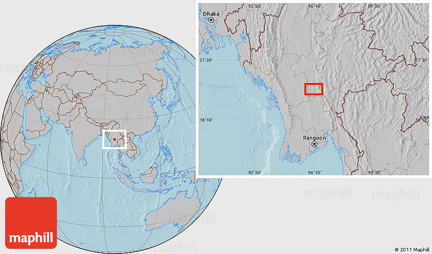 Maphill is a collection of map images. This image combines a gray map with the globe centered on Ye-e. Use the buttons under the image to switch to different map types.