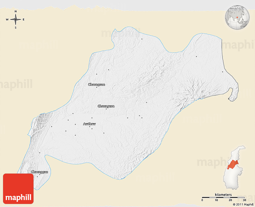 This map uses colors of vintage antique maps. Homalin is highlighted with white. The rest of the map is beige colored shaded relief map.