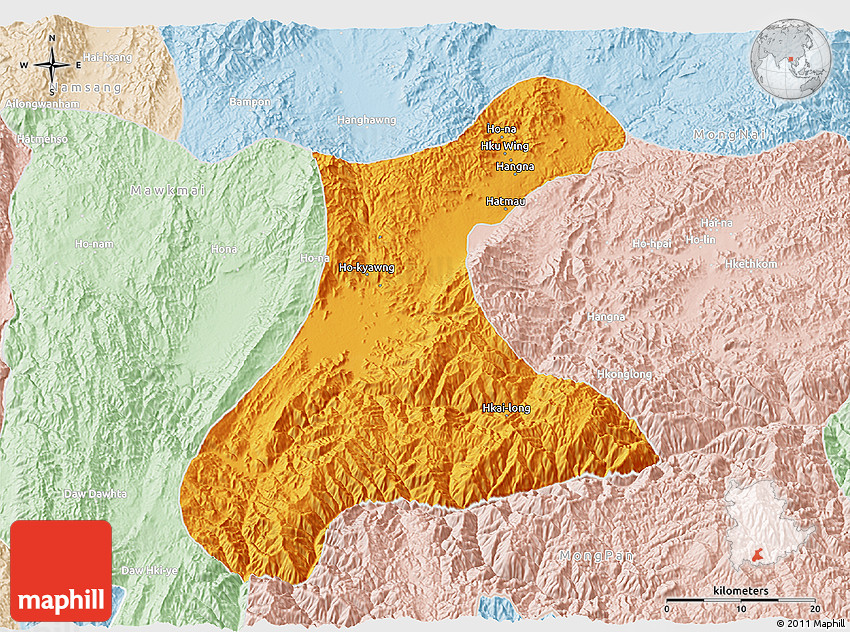 The 3D political map represents one of several map types and styles available. Look at Langkho, Shan, Burma from different perspectives.