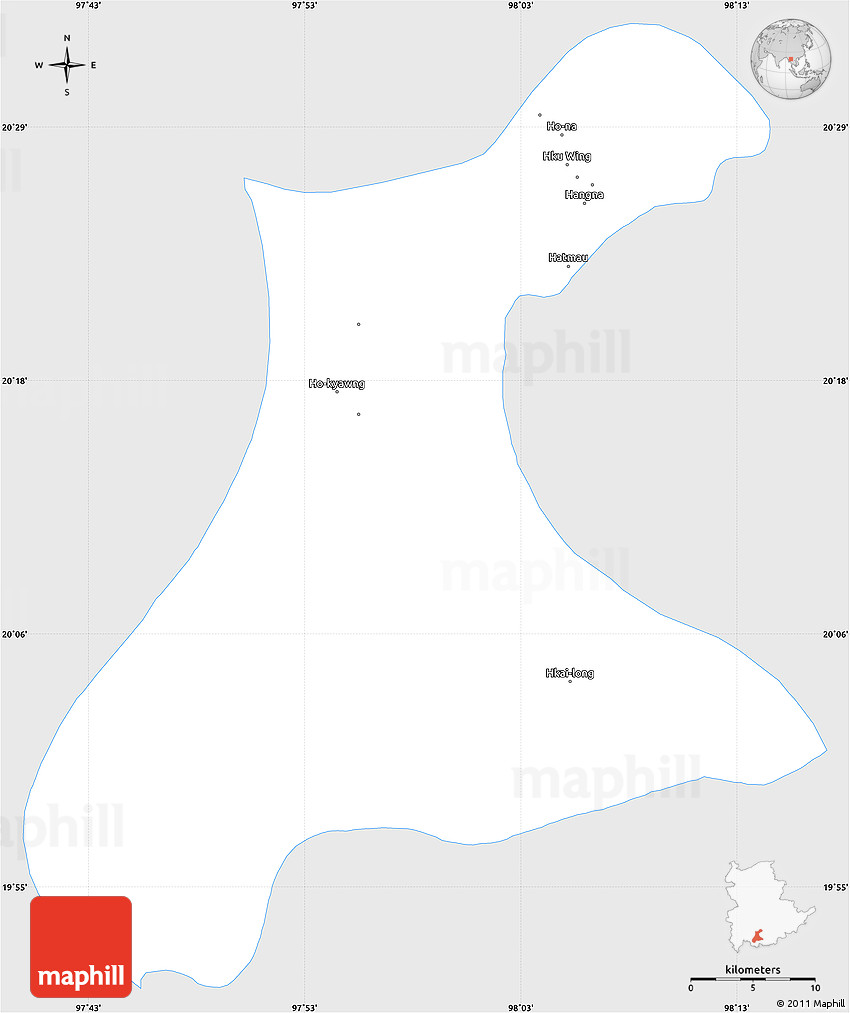 The simple silver style outline map represents one of several map types and styles available. Look at Langkho, Shan, Burma from different perspectives.