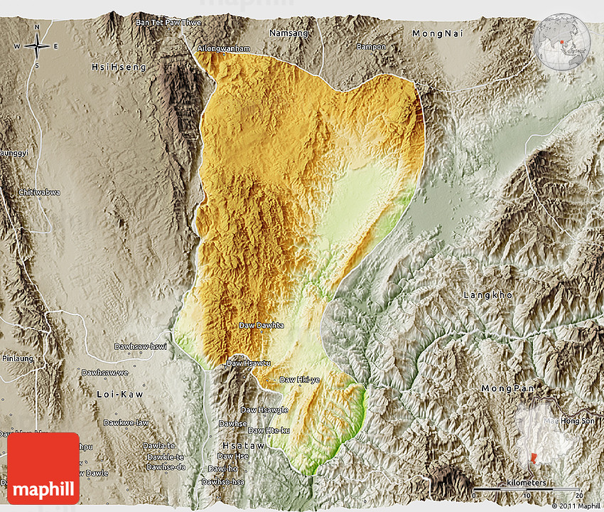 Physical map illustrates the mountains, lowlands, oceans, lakes and rivers and other physical landscape features of Mawkmai. Differences in land elevations relative to the sea level are represented by color.