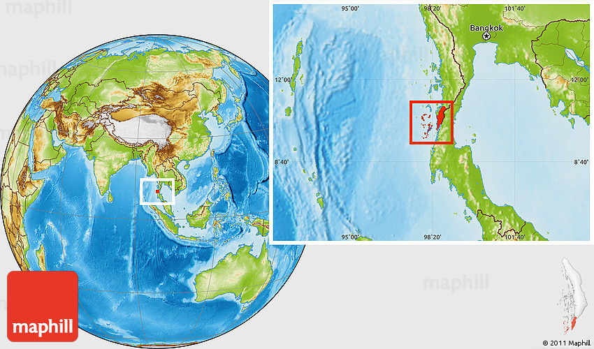 Maphill is a collection of map images. This image combines a physical map with the globe centered on Kawthaung. Use the buttons under the image to switch to different map types.