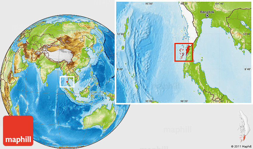 Maphill is a collection of map images. This image combines a physical map with the globe centered on Kawthaung. Use the buttons under the image to switch to different map types.