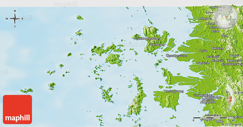 Physical map illustrates the mountains, lowlands, oceans, lakes and rivers and other physical landscape features of Mergui. Differences in land elevations relative to the sea level are represented by color.