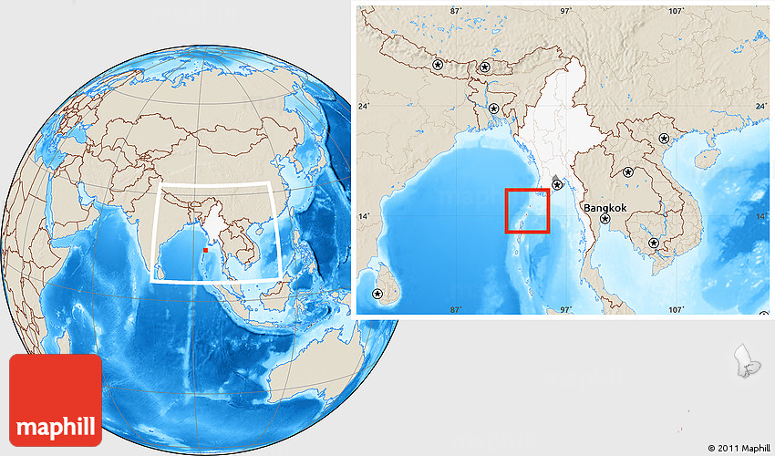 The shaded relief location map represents one of several map types and styles available. Look at Cocos Islands, Yangon (Rangoon), Burma from different perspectives.