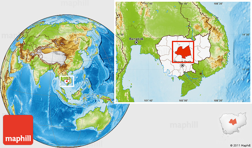 Maphill is a collection of map images. This image combines a physical map with the globe centered on Kampong Thom. Use the buttons under the image to switch to different map types.