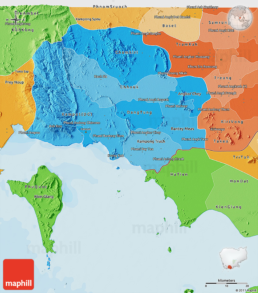 The 3D political shades map represents one of many map types and styles available. Look at Kampot from different perspectives.
