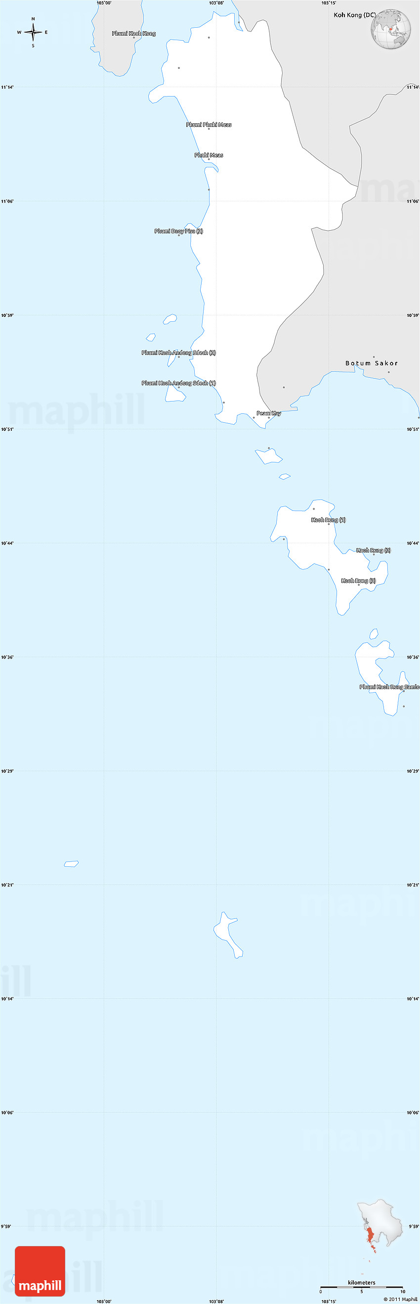 The simple silver style outline map represents one of several map types and styles available. Look at Kiri Sakor, Koh Kong, Cambodia from different perspectives.