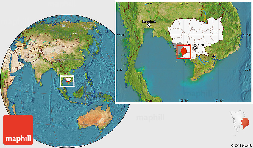 Maphill is a collection of map images. This image combines a satellite map with the globe centered on Sre Ambel. Use the buttons under the image to switch to different map types.