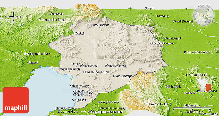 Physical map illustrates the mountains, lowlands, oceans, lakes and rivers and other physical landscape features of Sre Ambel. Differences in land elevations relative to the sea level are represented by color.
