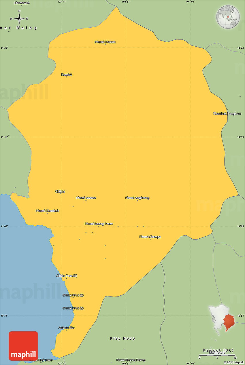The simple savanna style outline map represents one of several map types and styles available. Look at Sre Ambel, Koh Kong, Cambodia from different perspectives.
