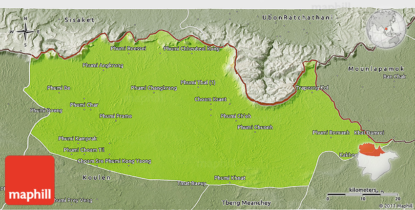 Physical map illustrates the mountains, lowlands, oceans, lakes and rivers and other physical landscape features of Chom Khsan. Differences in land elevations relative to the sea level are represented by color.