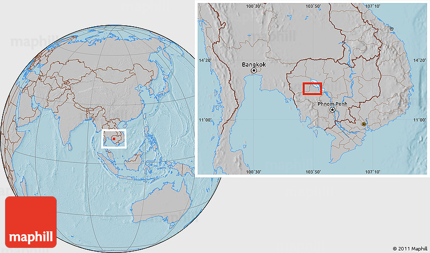 Maphill is a collection of map images. This image combines a gray map with the globe centered on Phumĭ Phteăh Kaôh (1). Use the buttons under the image to switch to different map types.