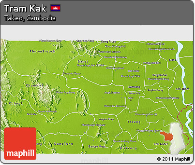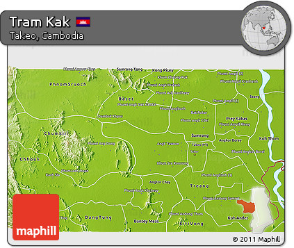 The 3D physical map represents one of several map types and styles available. Look at Tram Kak, Takeo, Cambodia from different perspectives.