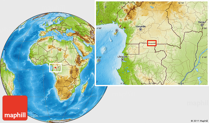 Maphill is a collection of map images. This image combines a physical map with the globe centered on Yen. Use the buttons under the image to switch to different map types.