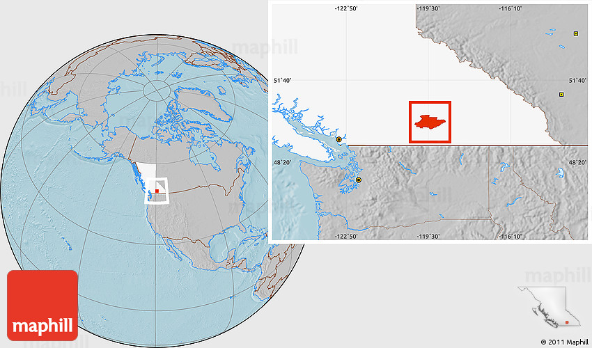 Maphill is a collection of map images. This image combines a gray map with the globe centered on Central Okanagan. Use the buttons under the image to switch to different map types.