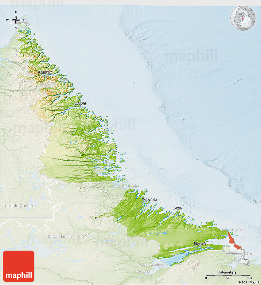 The 3D physical map represents one of several map types and styles available. Look at Division No. 11, Newfoundland and Labrador, Canada from different perspectives.