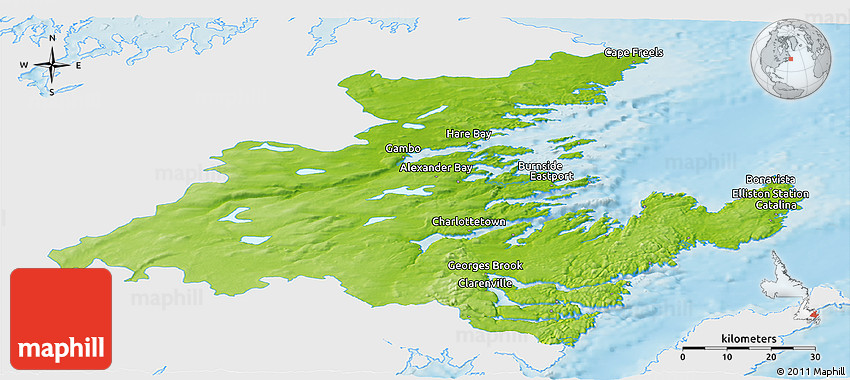 The panoramic physical map represents one of several map types and styles available. Look at Division No. 7, Newfoundland and Labrador, Canada from different perspectives.