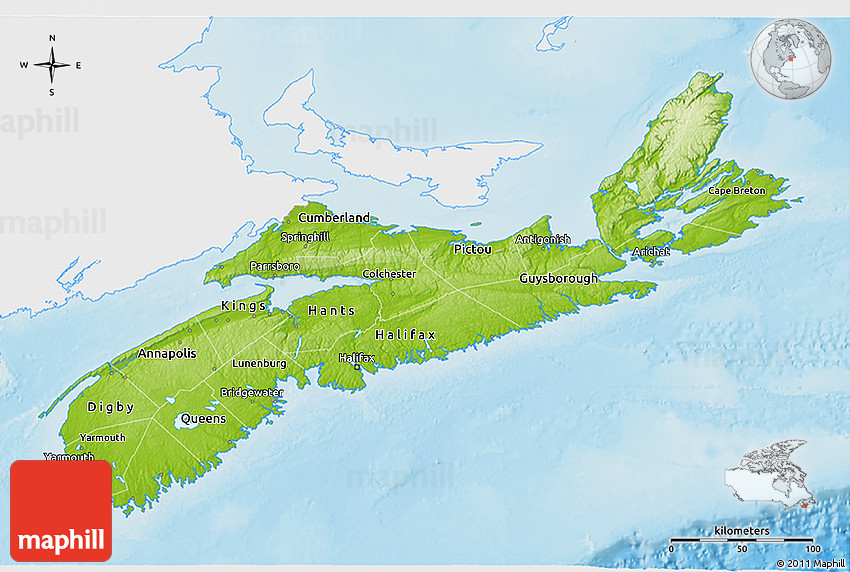 Physical map illustrates the mountains, lowlands, oceans, lakes and rivers and other physical landscape features of Nova Scotia. Differences in land elevations relative to the sea level are represented by color.
