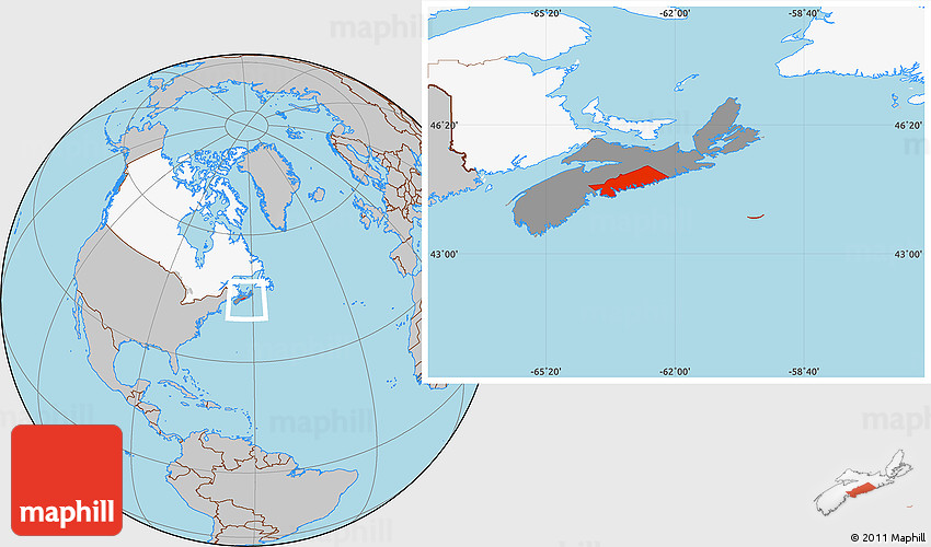 Maphill is a collection of map images. This image combines a gray map with the globe centered on Halifax. Use the buttons under the image to switch to different map types.