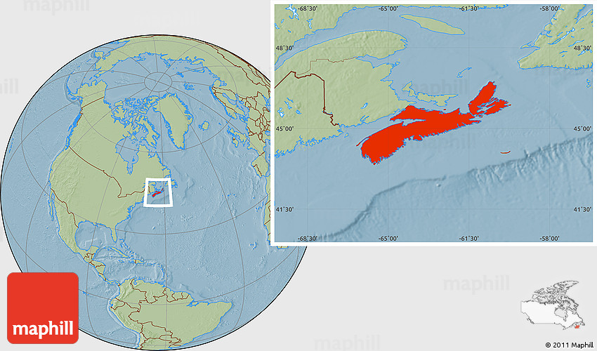 The savanna style location map represents one of many map types and styles available. Look at Nova Scotia from different perspectives.