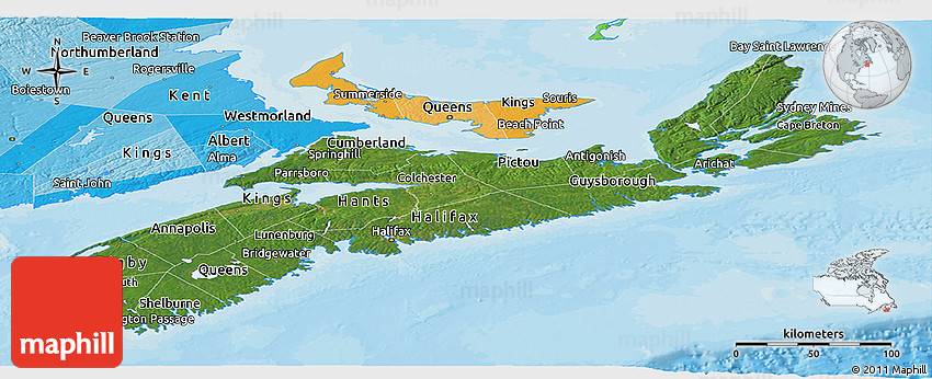 Each map type offers different information and each map style is designed for a different purpose. Read about the styles and map projection used in the above map (Satellite Panoramic Map of Nova Scotia, political shades outside).