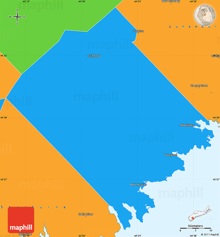 The simple political outline map represents one of several map types and styles available. Look at Queens, Nova Scotia, Canada from different perspectives.
