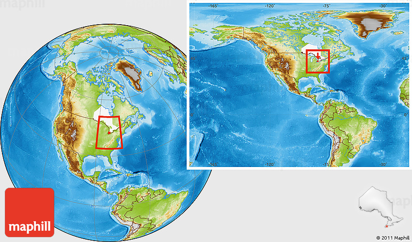 Maphill is a collection of map images. This image combines a physical map with the globe centered on Chatham-Kent. Use the buttons under the image to switch to different map types.