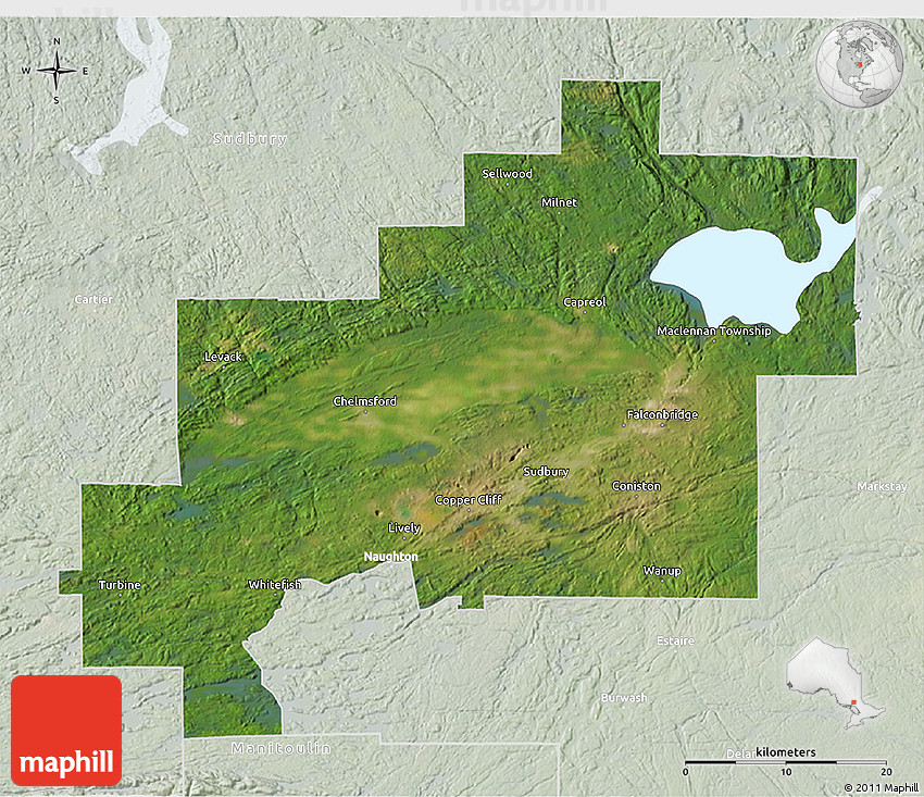 Satellite map shows the Earth's surface as it really looks like. The above map is based on satellite images taken on July 2004. This satellite map of Greater Sudbury / Grand Sudbury is meant for illustration purposes only. For more detailed maps based on newer satellite and aerial images switch to a detailed map view.