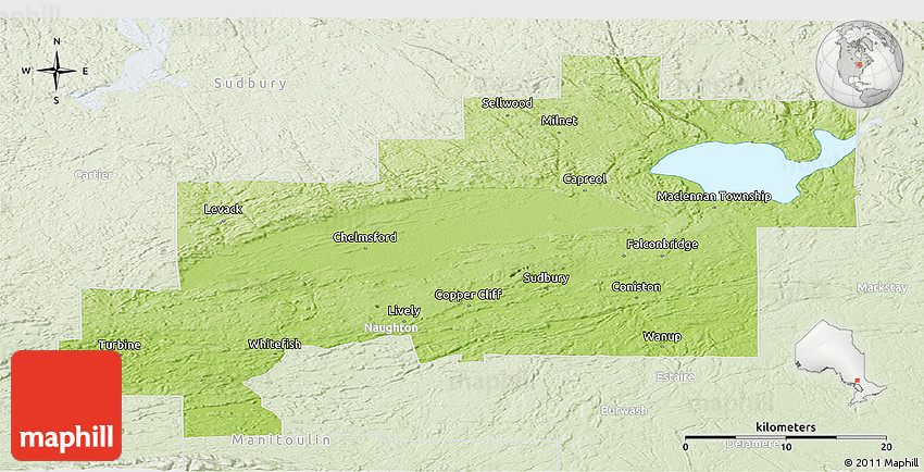 Embed the above physical panoramic map of Greater Sudbury / Grand Sudbury into your website. Enrich your blog with quality map graphics. Make the web a more beautiful place.