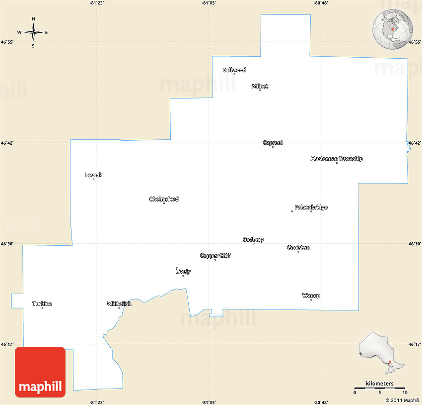 Maphill is a collection of map graphics. This simple outline map of Greater Sudbury / Grand Sudbury is one of these images. Use the buttons under the image to switch to more comprehensive and detailed map types.