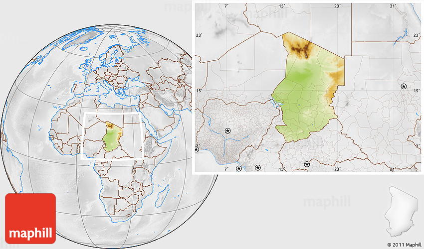 Maphill is a collection of map images. This image combines a physical map with the globe centered on Chad. Use the buttons under the image to switch to different map types.