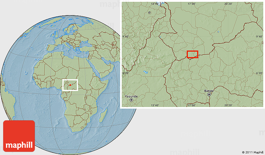 Maphill is a collection of map images. This image combines a savanna style map with the globe centered on Bedongui. Use the buttons under the image to switch to different map types.
