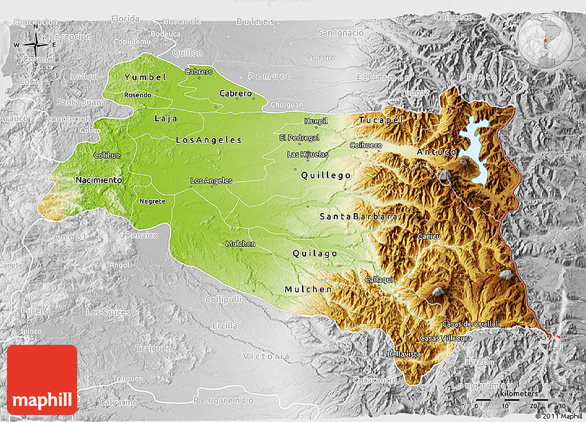 Physical map illustrates the mountains, lowlands, oceans, lakes and rivers and other physical landscape features of BIOBIO. Differences in land elevations relative to the sea level are represented by color.