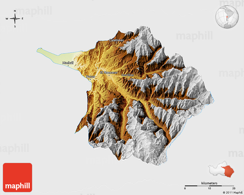 Physical map illustrates the mountains, lowlands, oceans, lakes and rivers and other physical landscape features of Machali. Differences in land elevations relative to the sea level are represented by color.