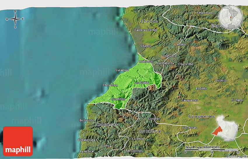 The 3D political map represents one of several map types and styles available. Look at Pelluhue, CAUQUENES, Chile from different perspectives.