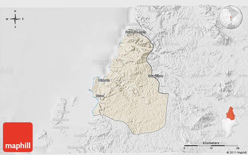The 3D shaded relief map represents one of several map types and styles available. Look at Tome, CONCEPCION, Chile from different perspectives.