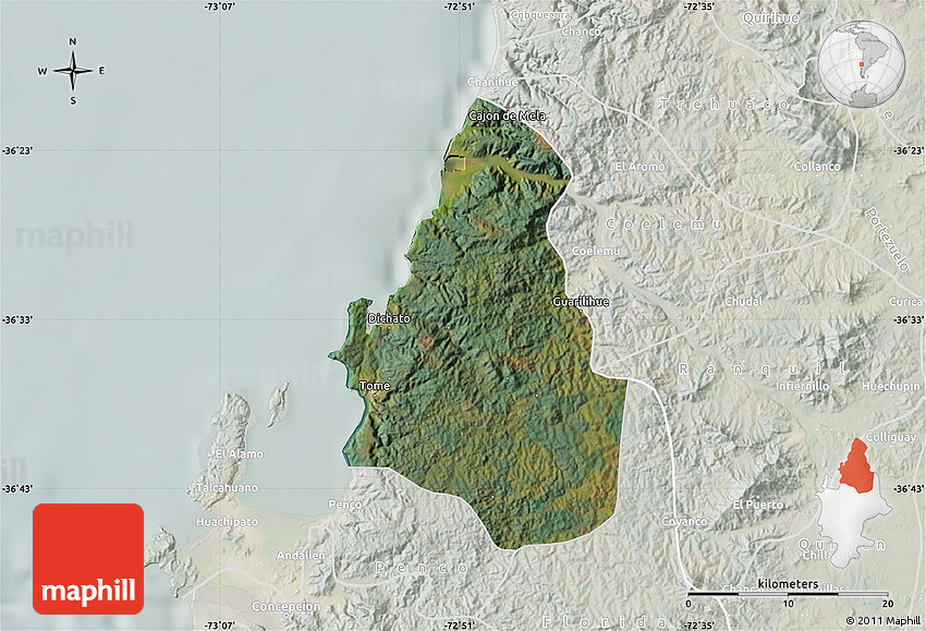 The flat satellite map represents one of several map types and styles available. Look at Tome, CONCEPCION, Chile from different perspectives.