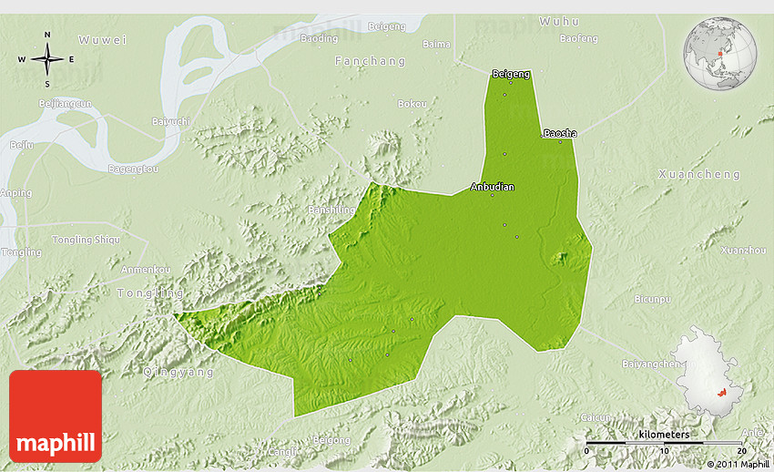 The 3D physical map represents one of several map types and styles available. Look at Nanling, Anhui, China from different perspectives.