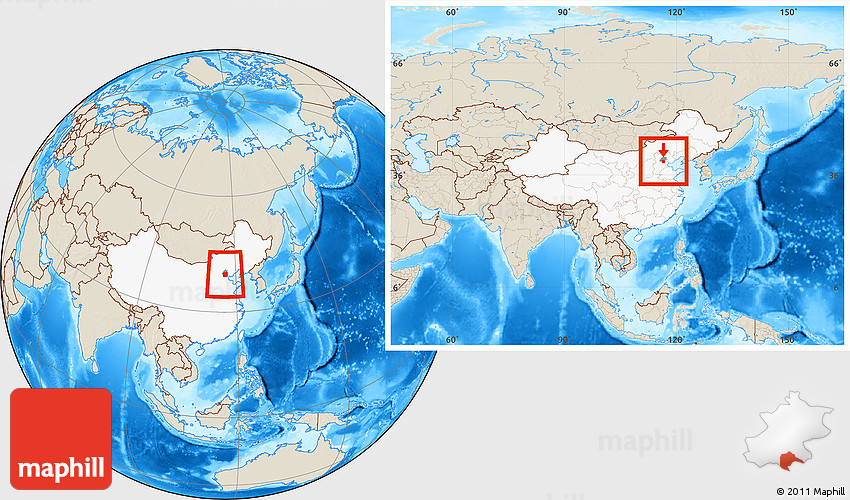 Maphill is a collection of map images. This image combines a shaded relief map with the globe centered on Daxing. Use the buttons under the image to switch to different map types.