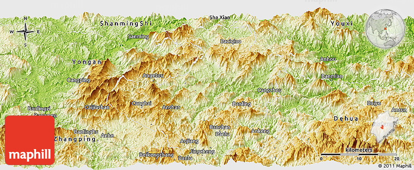 The panoramic physical map represents one of several map types and styles available. Look at Datian, Fujian, China from different perspectives.