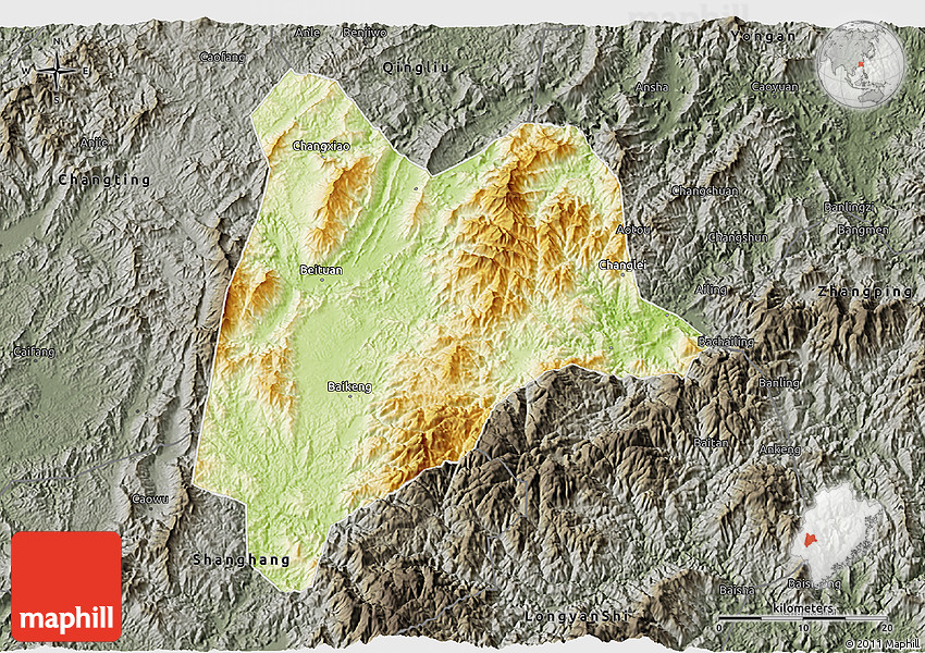Each map type offers different information and each map style is designed for a different purpose. Read about the styles and map projection used in the above map (Physical 3D Map of Liancheng, darken, semi-desaturated).