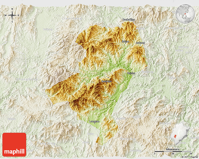 Each map type offers different information and each map style is designed for a different purpose. Read about the styles and map projection used in the above map (Physical 3D Map of Longyan Shi, lighten).