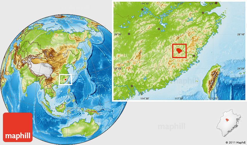 Maphill is a collection of map images. This image combines a physical map with the globe centered on Sha Xian. Use the buttons under the image to switch to different map types.
