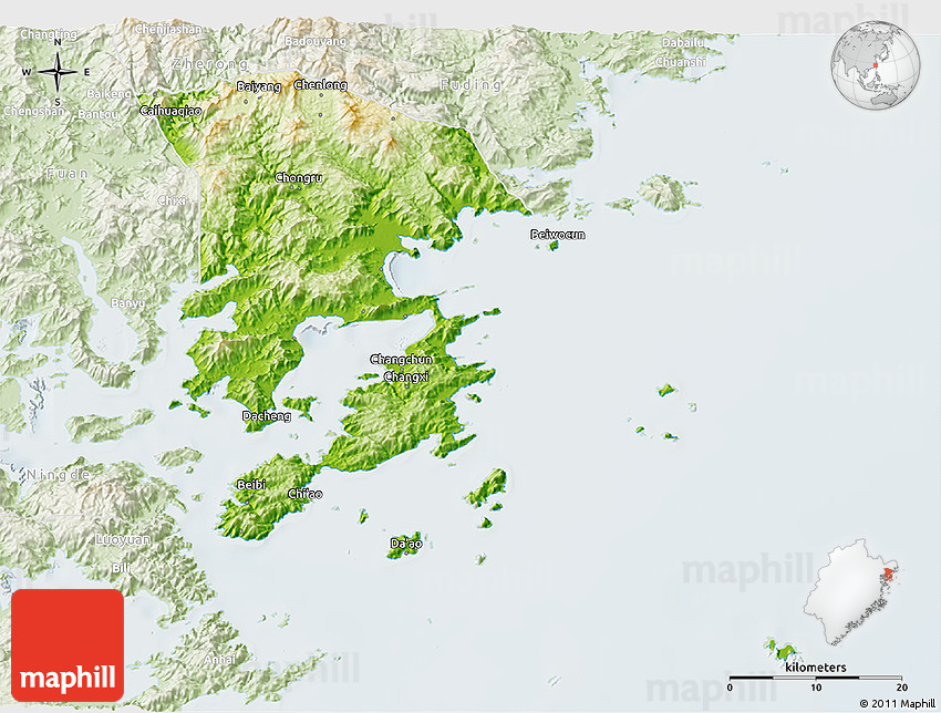 The 3D physical map represents one of several map types and styles available. Look at Xiapu, Fujian, China from different perspectives.